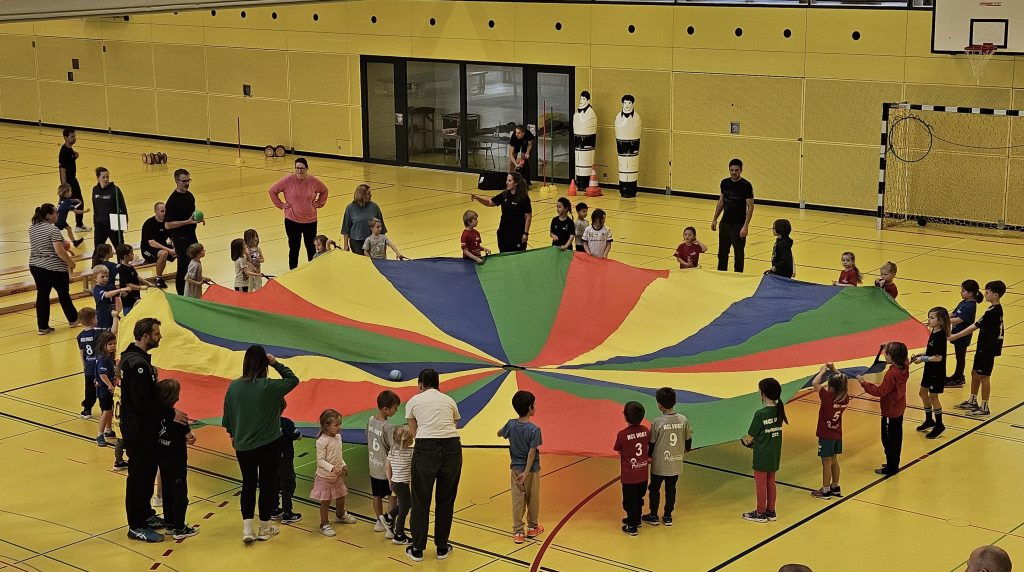 An acht abwechslungsreichen Stationen durften die kleinen Handballerinnen und Handballer ihr Können zeigen – teilweise auch im Duell gegen die Erwachsenen! Besonders der vielseitige Parcours sorgte für Begeisterung und forderte Ballgefühl und Koordination. Während die Laufzettel ausgewertet wurden, brachte der große, bunte Fallschirm alle noch einmal in Bewegung – ein schöner gemeinsamer Abschluss.