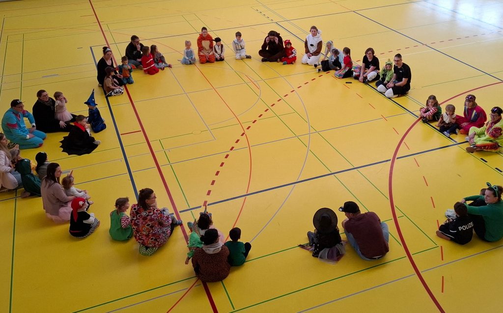 Zum kunterbunten Fasnetstraining trafen sich unsere jüngsten Handballtalente gemeinsam mit ihren Eltern und Geschwistern. Fast 60 lustig verkleidete Erwachsene und Kinder begannen mit dem „Gute-Laune-Lied“ statt mit unserem gewohnten „Theo-Theo“. Nachdem bei der Familienversion von „Mein rechter, rechter Platz ist leer“ Piraten, Elsas, Pippi Langstrumpf und Frösche die Plätze getauscht hatten, waren alle warm für den Parcours.